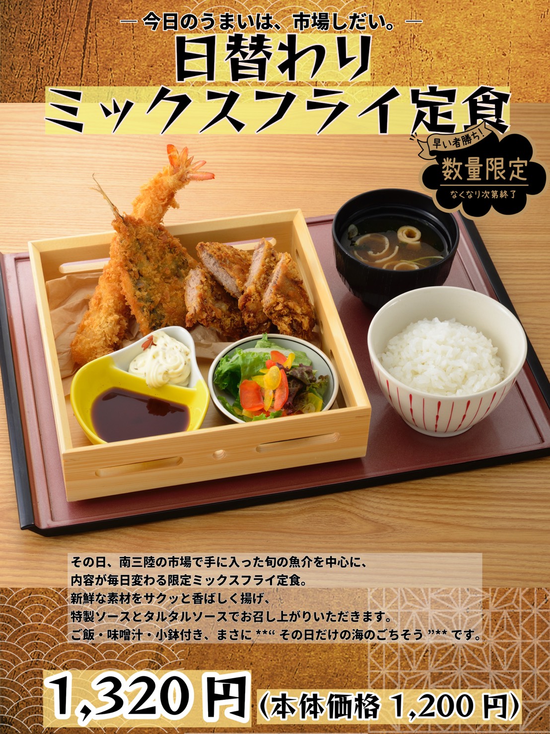 熟練の寿司職人が握るおまかせ握りをはじめ、南三陸の海鮮を使用したキラキラ丼などのメニューをご用意しております。また、南三陸の新名物「さんこめし」は、当店が発祥となります。